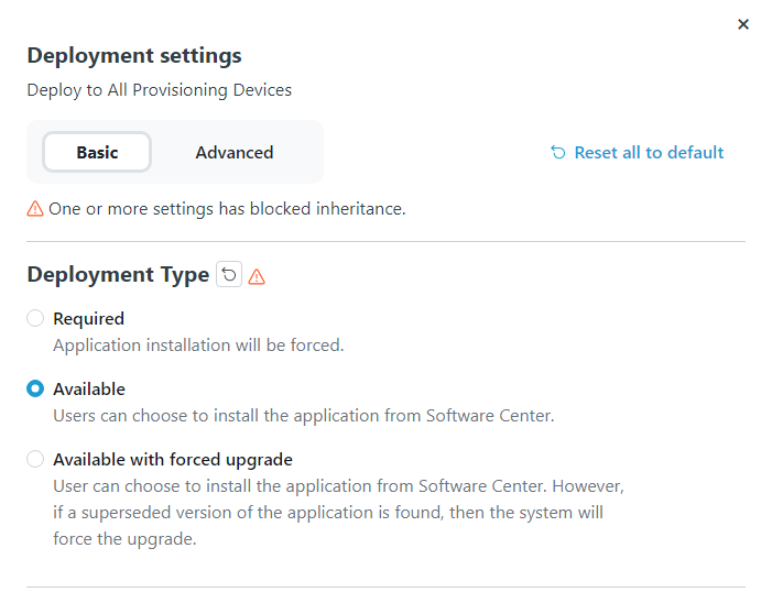 The deployment setting change will be applied when the next application version is imported, or you can apply it to the current version by re-deploying the app. End users can then install the app from Company Portal (Intune) or Software Center (MECM).